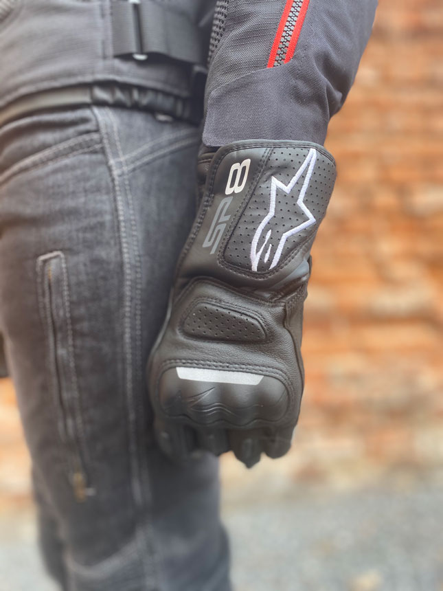 Kvalita rukavic je neprávem podceňována. Přitom ruce jsou, i při celkem nevinných pádech, „na ráně“ většinou jako první. I na kolečkových bruslích jezdíme s chrániči zápěstí. Zkušený prodejce se podívá na vaše ruce a jde téměř na jisto. Nicméně, i tak je nutné vyzkoušet několik modelů a velikostí. Opět, jako u všeho ostatního. Rukavice nám musí dokonale sedět. Musíme mít dostatečnou jistotu v úchopu řídítek, nesmí nás tlačit na konečky prstů. Znám z vlastní zkušenosti. Po několika desítkách minut je to bolest na zbláznění. Bříška prstů jsou velmi citlivá a z toho plyne naprostá ztráta koncentrace a také větší únava. V našem případě, po asi třech nebo čtyřech „testech“, padla volba na rukavice ALPINESTARS, STELLA SP-8. Cena je sice trochu vyšší, ale bezpečnost musíme mít na prvním místě. Zvlášť v případě Báry, která se živí grafikou.
