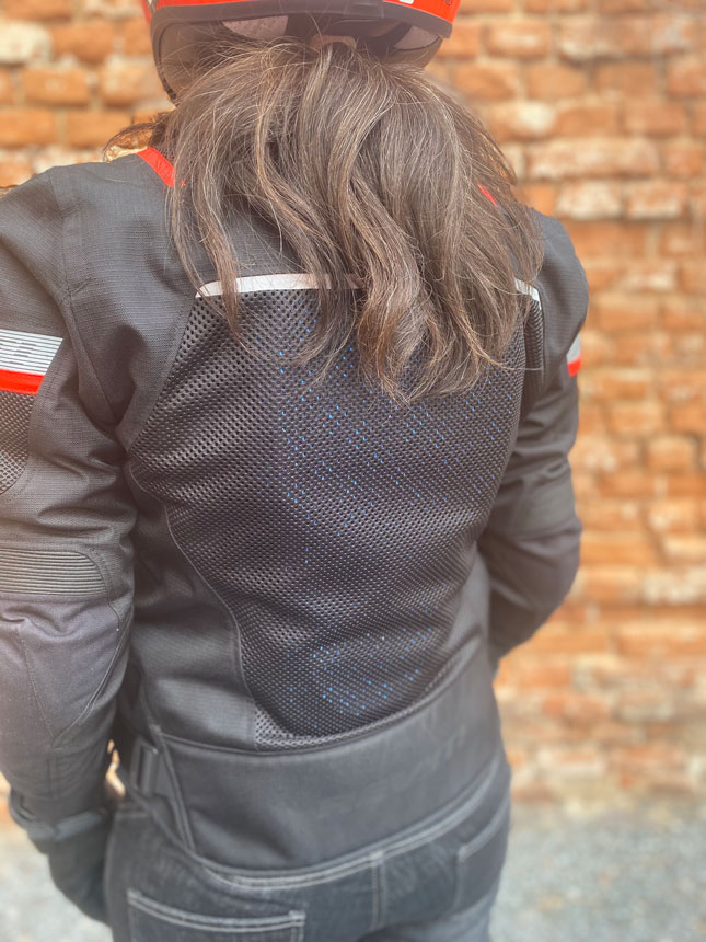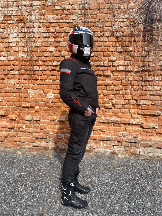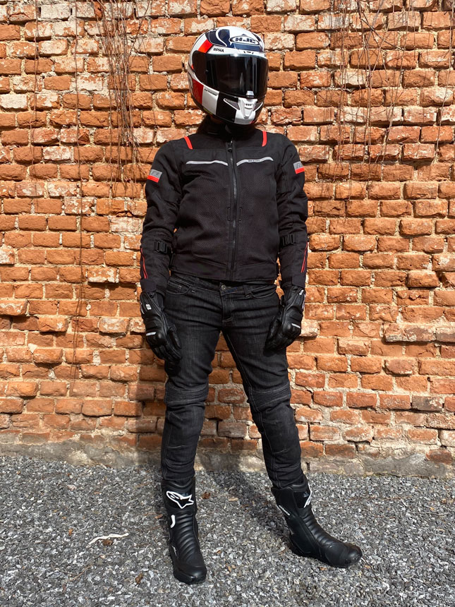 Bundu jsme chtěli textilní, spíš na provoz za hezkého počasí. Tahat začátečnici do nějaké sloty není právě nejšťastnějším řešením. Pokud jí ježdění nechceme znechutit v samém zárodku. Výběr je naštěstí převeliký a když se k tomu přidá rada odborníka a ochota „oběti“ vyzkoušet víc různých bund, což není právě pohodlná záležitost, tak se dílo podaří. Námi vybraná bunda REVIT TORNADO 3 je všestranná bunda do nejrůznějších podmínek, v období jaro až podzim. V zimě stejně nejezdíme. V základu je vybavena protektory na ramenou a loktech, na zádech má kapsu pro vložení chrániče páteře a na hrudi je možno přidat ještě ochranu hrudníku. Takže velmi dobrý bezpečnostní standard. Navíc je dobře odvětraná a zároveň poskytuje solidní voděodolnost, aby nebylo nutné při každé přeháňce navlékat nepromok.