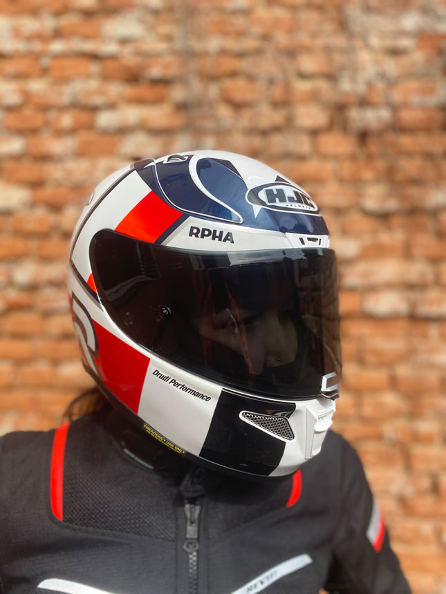 V našem případě byla vybrána přilba HJC RPHA 11, v designu Ben Spies MC 1. Bez sluneční clony. Důvodem je její vysoká pevnost, komfort a nízká váha, díky použití tří různých materiálů – uhlíkové vlákno, aramidové vlákno (pevnější než kevlar) a sklolaminát (Premium Integrated Matrix PLUS). Se zapínáním na bezpečnostní D kroužek.