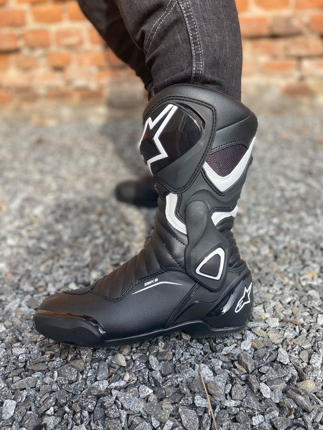 Zkoušení motorkářských bot, nemyslím bot na ježdění na skútru po městě, musíme věnovat asi stejně času a pozornosti jako zkoušení lyžáků. Prostě je zapnout „na doraz“ a chodit v nich aspoň půl hodiny po prodejně. Pokud máte tu možnost. Jen tak poznáme, „kde nás bota tlačí“. Dbáme-li na bezpečnost a zároveň chceme v motorkářských botách udělat pár pohodlných kroků, sáhneme po typu bot, jako je na fotce. Nemyslím zrovna přesně tyto, každé dámě bude slušet a vyhovovat něco jiného, ale typově. Pevné boty, s ochranou nejenom holení kosti, ale také kotníku, paty a malíkové hrany. To je ta destička, připomínající slider, na vnější straně přední části boty.