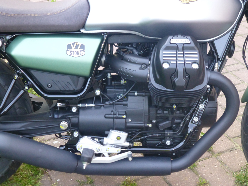 V porovnání s předchozím modelem, má letošní V7 Stone vyšší úroveň výbavy a na první pohled odráží svou designovou vyspělost. Do které se promítají také větší rozměry motoru a velkoryse dimenzované výfuky. Při pohledu zezadu pak také vynikne větší kloubový hřídel a širší zadní kolo. Stejně, jako pár robustnějších předních tlumičů KYB. Nové jsou stylové boční panely a s novým, kratším zadním blatníkem a výfuky, dávají novince atraktivnější vzhled.
