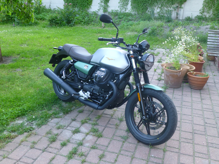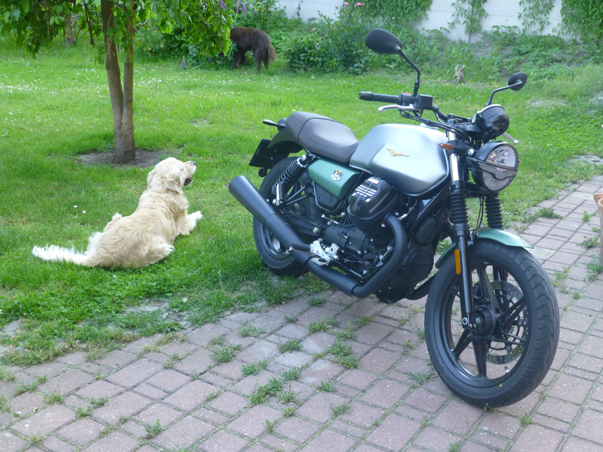 Při prvním rozjetí se mi zdála malinko těžší na předek. Tento pocit zmizel velice rychle a pravděpodobně byl dán faktem, že jsem bezprostředně před tím jezdil na jiných motorkách. Nějaká divná “paměť”. Motorku jsem si vyzvedával v pátek, v Braníku, a hned na začátek mne čekal průjezd ucpanou Prahou, na její zcela opačný konec. Od Barrandovského mostu ucpáno až na výpadovku na Ústí n.L.. Už při popojíždění, mezerou mezi auty, jejichž řidiči často nevynikají příliš velkou vstřícností a sem tam vám tu mezeru přivřou, se mi potvrdila jednak úžasně snadná ovladatelnost a také, díky velmi příjemnému zvuku linoucímu se z výfuků, že to až zase tolik lidí neštve a najde se i dost takových, kteří vám uhnou. V7 totiž i na jedince nefandící motorkách působí sympaticky. Nebo jinak, nepůsobí nesympaticky. Není agresivní. Když jsme u ježdění po městě, V7 naprosto nesnáší díry v silnicích, nebo, to snad nejvíc, příčné hrby. Je evidentní, že italští konstruktéři nějak nepočítají, že jejich klenoty budou týrány na rozbitých silnicích připomínajících víc dráhu na testování tlumičů. Jakmile ale vjedeme na kvalitní povrch, stane se jízda skutečnou radostí.