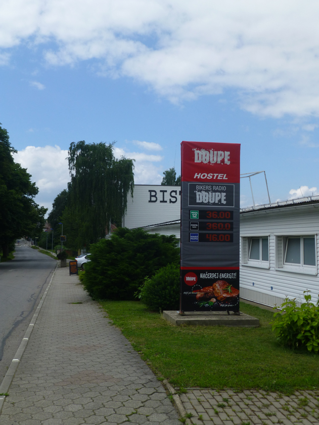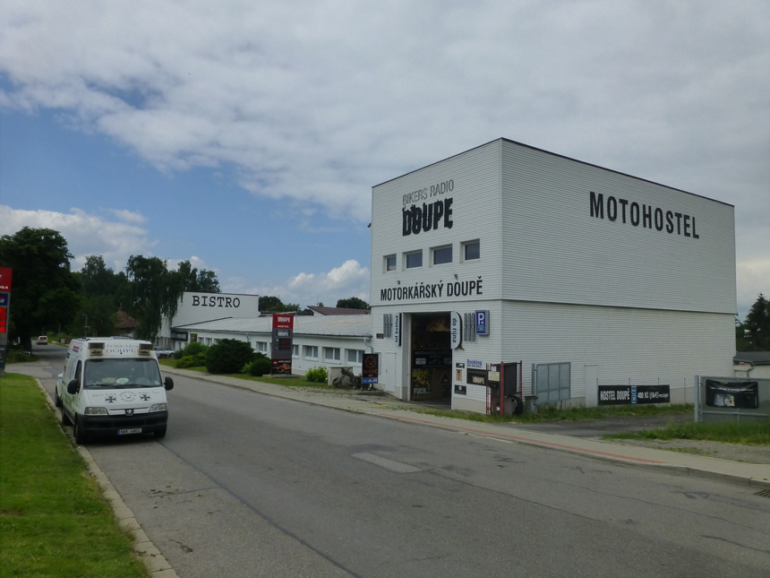 Na kraji Humpolce, na dohled od silnice vedoucí do, nebo z Havlíčkova Brodu, naproti benzínové pumpě, stojí světlá, hranatá budova (původně tady byla tiskárna Web-to-Print), které dominují velké nápisy: „MOTOHOSTEL, „BIKERS RADIO DOUPĚ“ a – „MOTORKÁŘSKÝ DOUPĚ“. A na druhé, levé straně je ještě „BISTRO“. Bistro je v provozu, když musí být, z „vyšší moci“, Doupě zavřeno.