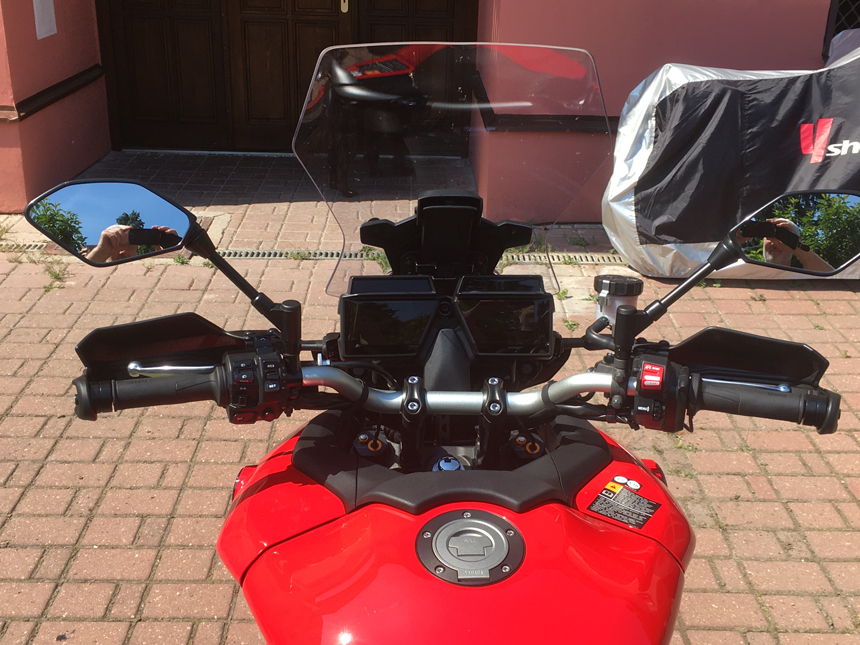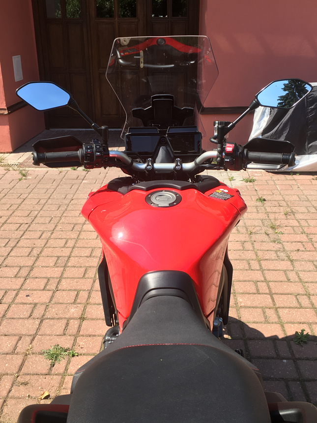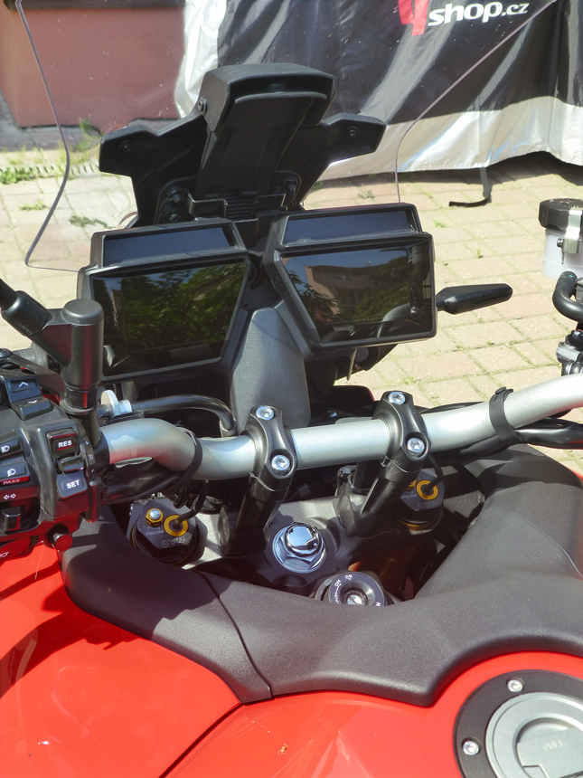 Hned při prvním usednutí, do příjemně tvarovaného sedla, jsem si uvědomil, jak solidně motorka působí. Všechno pasuje, je přesně tam, kde to chci mít a je vyrobeno z kvalitních materiálů. Když položím ruce na kónická řídítka, je to pohoda. Správná šířka, výška i vzdálenost. Veškeré ovladače dokonale v dosahu prstů. Design kapotáže se mi líbí mnohem víc než u minulých modelů. Pro můj vkus tam bylo zbytečně moc různých hran. Jediné, co vzbudilo mé mírné rozpaky, byl dvou, respektive čtyřdílný TFT displej. Ale k tomu se dostanu později. I když bylo vedro k padnutí, věnoval jsem chvilku uvelebování se v příjemném sedle a nastavení zrcátek. Je to lepší než za jízdy. A také zkoumání, co všechno ukazují displeje a jak se co nastavuje. Po chvilce jsem zjistil, jak funguje menu. Nic složitého. Docela logické. Jen, při přesedání z motorky na motorku, musím vždy pojmout rozdíly ve filozofii. Na něco si zvyknu a – musím se učit zase něco nového.