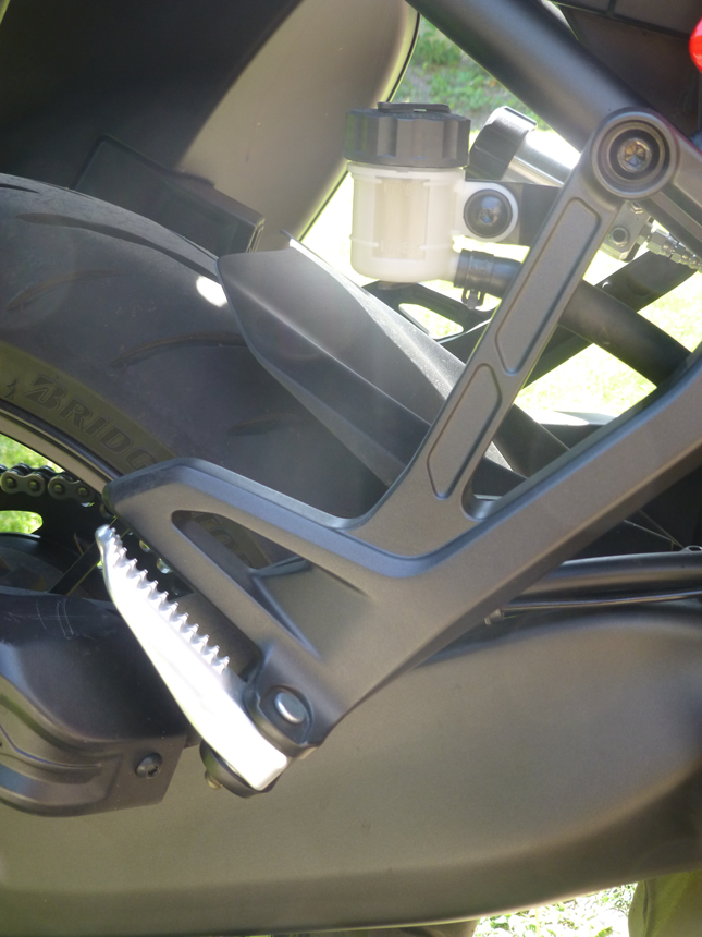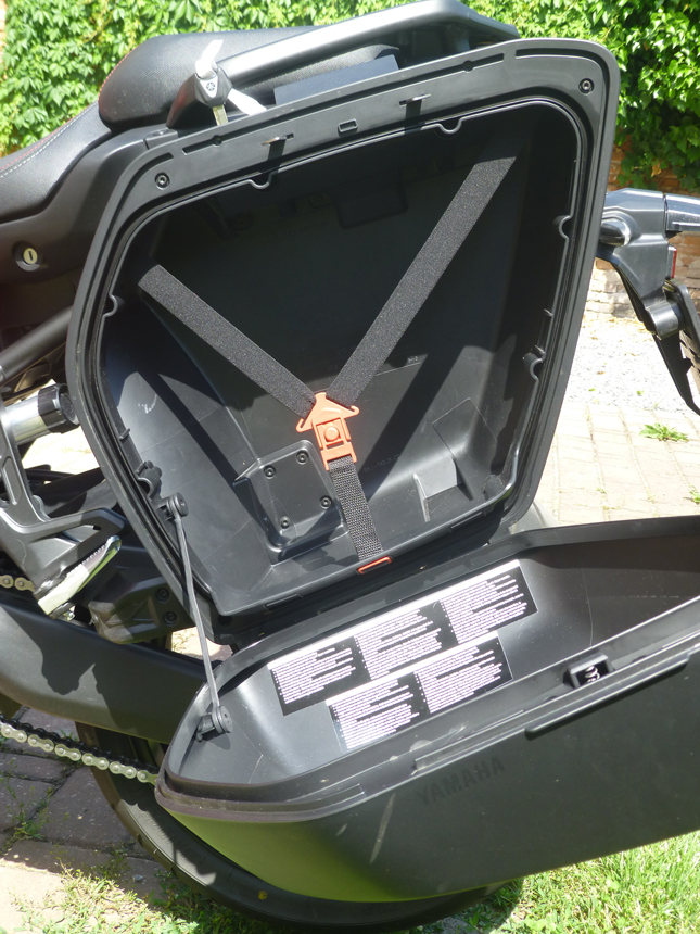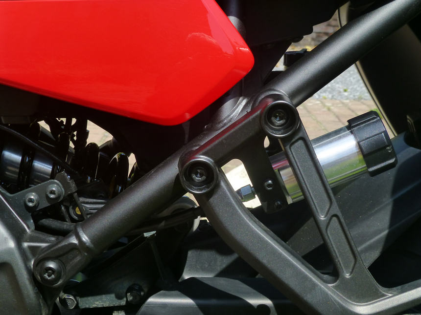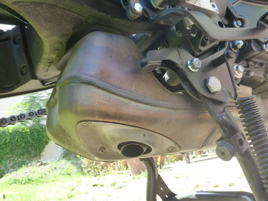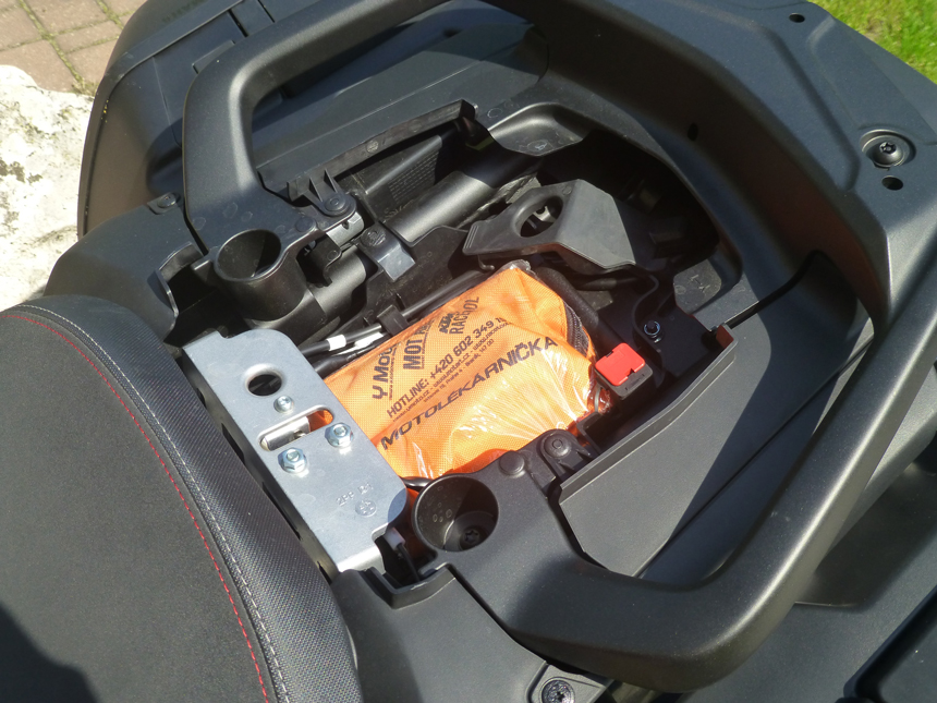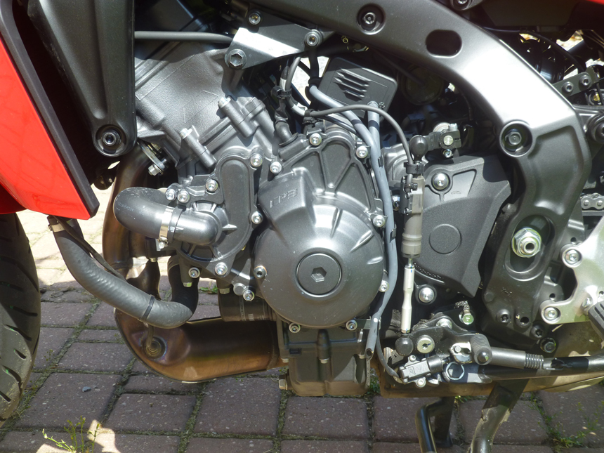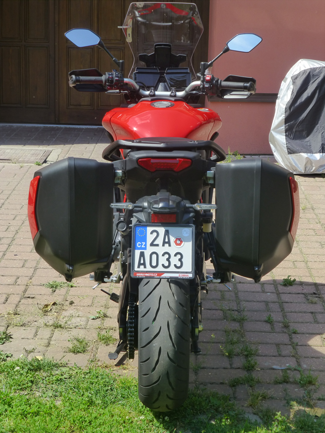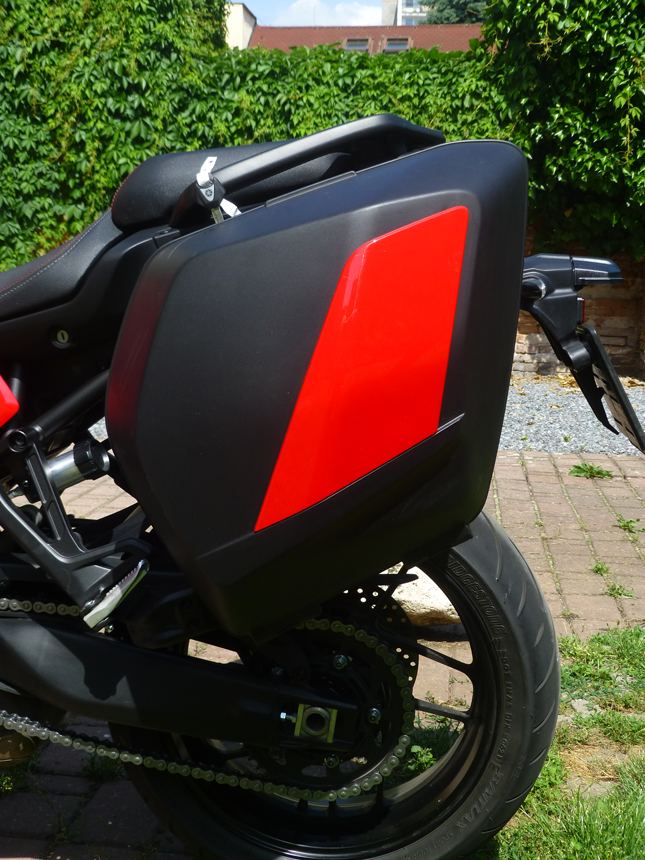 Chyběl mi jadrný, „tříválcový“ zvuk. Hučení, pouze se zesilující úměrně stoupajícím otáčkám, mne tentokrát neoslovilo. Ani při zpomalování a podřazování se nic nedělo. Když jsem, kvůli focení, sundal boční kufry, hrklo ve mně. Kde je výfuk? Už jsem si myslel, že jsem ho někde ztratil. Neztratil. Emise a zvuk opouštějí tlumič dvěma otvory nasměrovanými k zemi pod motorkou přímo z tlumiče. Asi zase neblahý důsledek nějaké Euro normy. Na druhou stranu, umožňuje to symetrii zadních kufrů a jejich stejný objem. Něco za něco.