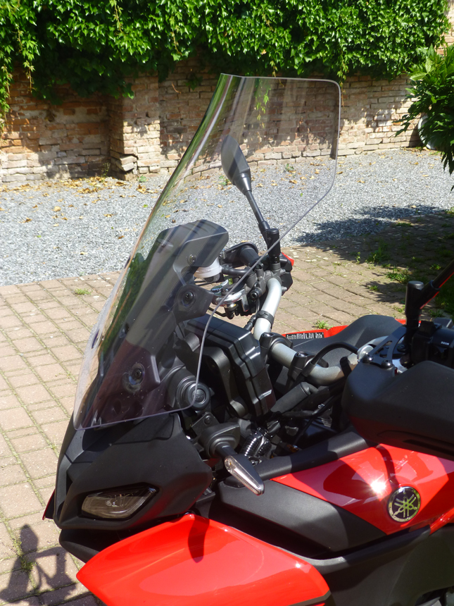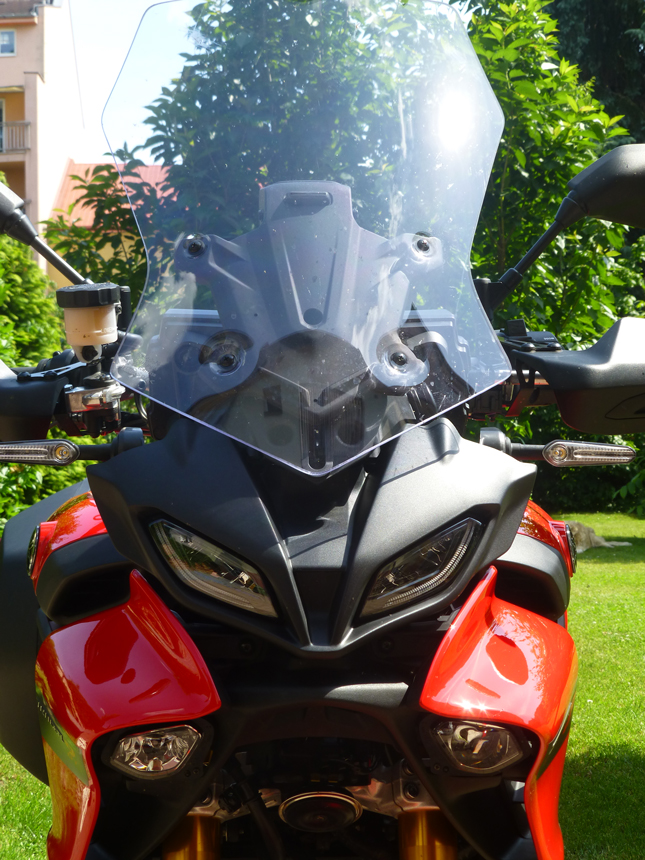 Co mne velmi mile překvapilo, bylo fungování jednoduše výškově nastavitelného větrného štítku. Tvarově příjemně jednoduchý, ladící s celkovým designem přídě stroje. Při mé výšce, 185 cm, mi poskytoval přiměřenou ochranu. I při bezpečném překračování rychlostních limitů na dálnici. Takže má-li někdo pod 180 cm, bude bezpečně za větrem.