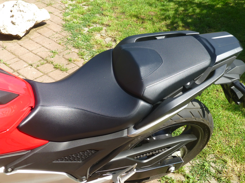 Jízdní pozice je vzpřímená, velmi pohodlná, uvolněná. Motorka působí „prostorným“ dojmem. Napomáhá to jednak výbornému přehledu v dopravě, ale také snadnému ovládání. Celkem bez únavy můžeme překonávat i větší vzdálenosti. Díky spotřebě benzínu, která se dá, při plynulé jízdě, stlačit i pod 3,5 l/100 km, nám nádrž, o objemu 14 l, vystačí na (teoreticky) 400 km. Nejezdíme na výpary, tak, dejme tomu, 350 km. To stejně dá, bez zastávky, jen málokdo. Zhruba pět hodin v sedle nikdo nevydrží. Já jsem vždy dělal pauzy po zhruba dvou hodinách nebo 150 km. Takže každou druhou zastávku v klidu natankujeme.