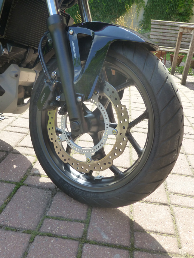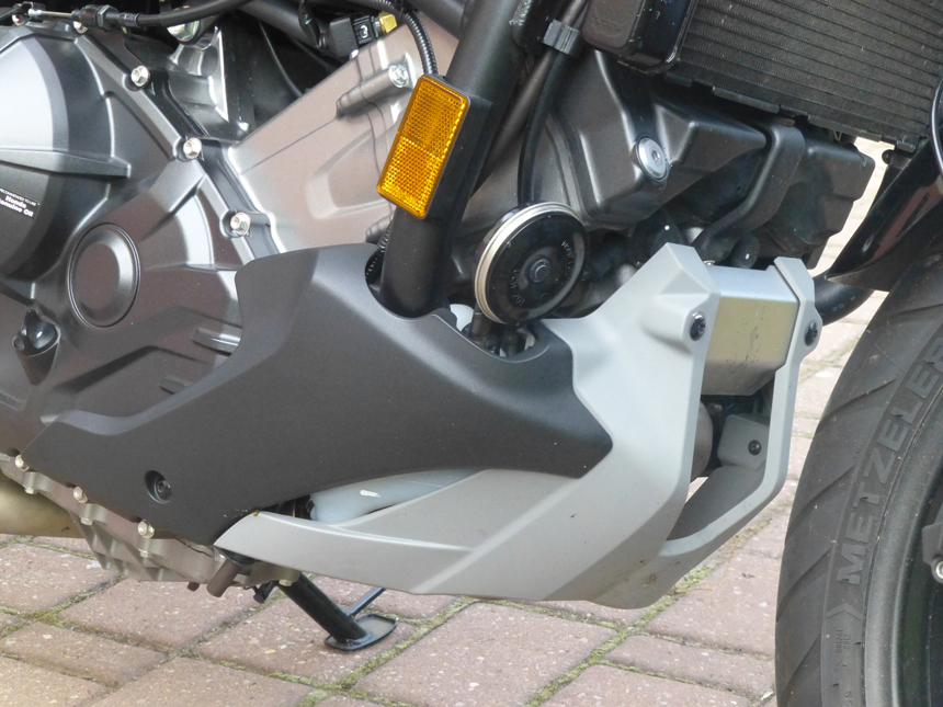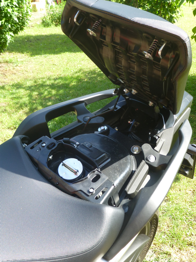 Absolutorium zaslouží i podvozek. Zdánlivě jednoduchý, žádná elektronika. Přední 41 mm Showa s dvojitým průtokovým ventilem a zadní centrální tlumič s přepákováním Pro-Link s možností nastavení předpětí, odvádějí dokonale svou práci. I na mizerných silnicích, nebo ve městě, není jízda nepříjemnou. Jakmile se dostaneme na hladší asfalt, v podstatě o podvozku vůbec nevíme. Vše drží pohromadě zcela přepracovaný, tuhý, trubkový rám. Nejenom, že ztratil mírně na váze, ale díky přemístění baterie a úpravě tvaru vzduchové komory byla zvětšena praktická schránka na drobná zavazadla. Nebo uložení helmy. Výborně nastavenému podvozku rovnocenně sekundují také jednokotoučové, vlnovité, dvoukanálovým ABS ovládané brzdy NISSIN. Přední o průměru 320 mm s dvoupístovým třmenem a zadní s jednopístovým třmenem o průměru 240 mm.