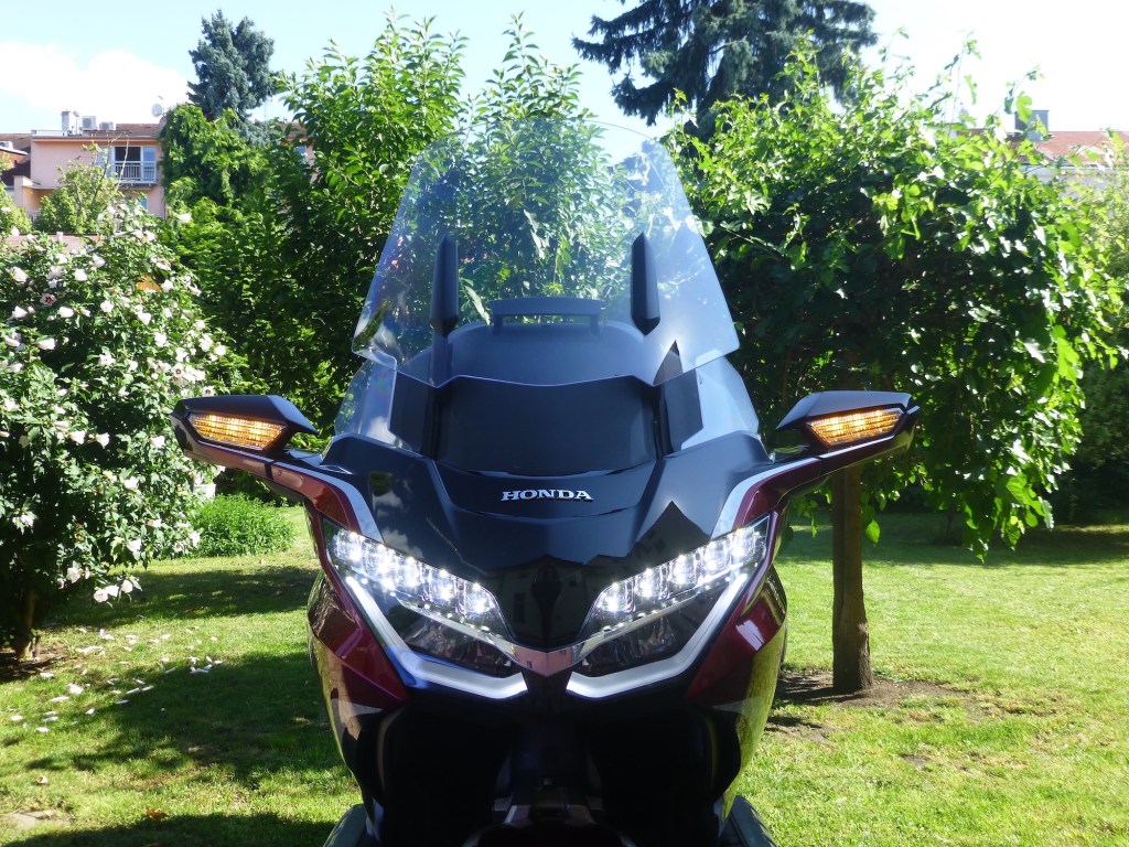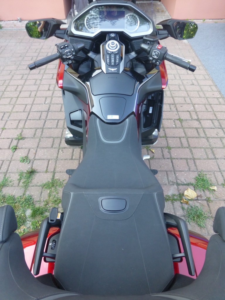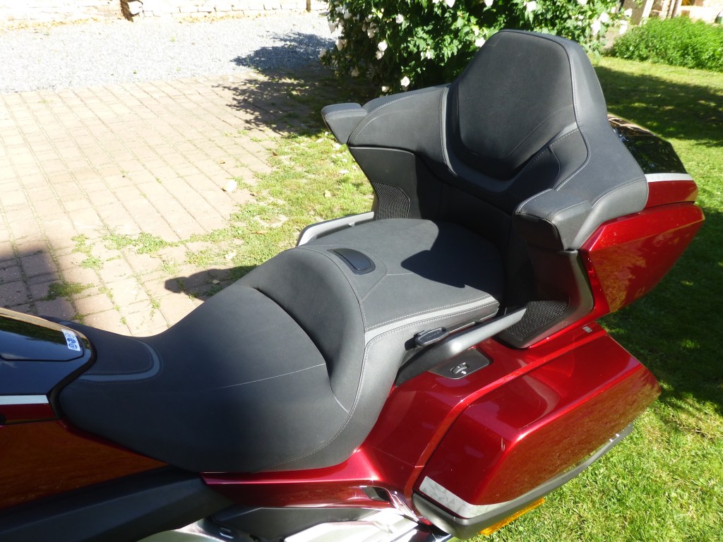 Chvilku se tedy budu věnovat jízdnímu komfortu. GOLD WING TOUR ho nabízí vrchovatě. Díky velmi nízké a prostorné architektuře poskytuje pocit velkého prostoru. Aerodynamicky tvarovaná kapotáž odvádí vzduch kolem jezdce i spolujezdce, čímž zajišťuje příjemné ochlazující proudění. Velký, elektricky ovládaný štít lze plynule nastavit do optimální polohy. Sedlo jezdce i spolujezdce nabízí dostatek komfortu pro celodenní jízdu a díky čalounění, v kombinací veluru a syntetické kůže, poskytuje opravdu velké pohodlí. Sklon opěradla spolujezdce byl upraven pro ještě lepší pohodlí. Vylepšené reproduktory produkují živější a kvalitnější zvuk. Další moderní funkce, jako inteligentní klíč Smart Key, Apple CarPlay, Android Auto, či Bluetooth, zajišťují nadstandardní pohodlí a konektivitu. Tím bych asi s výčtem komfortu skončil. Mám lehkou „obavu“, že GOLD WING, ve své další generaci, může nabízet kávu, nebo chlazené nápoje.