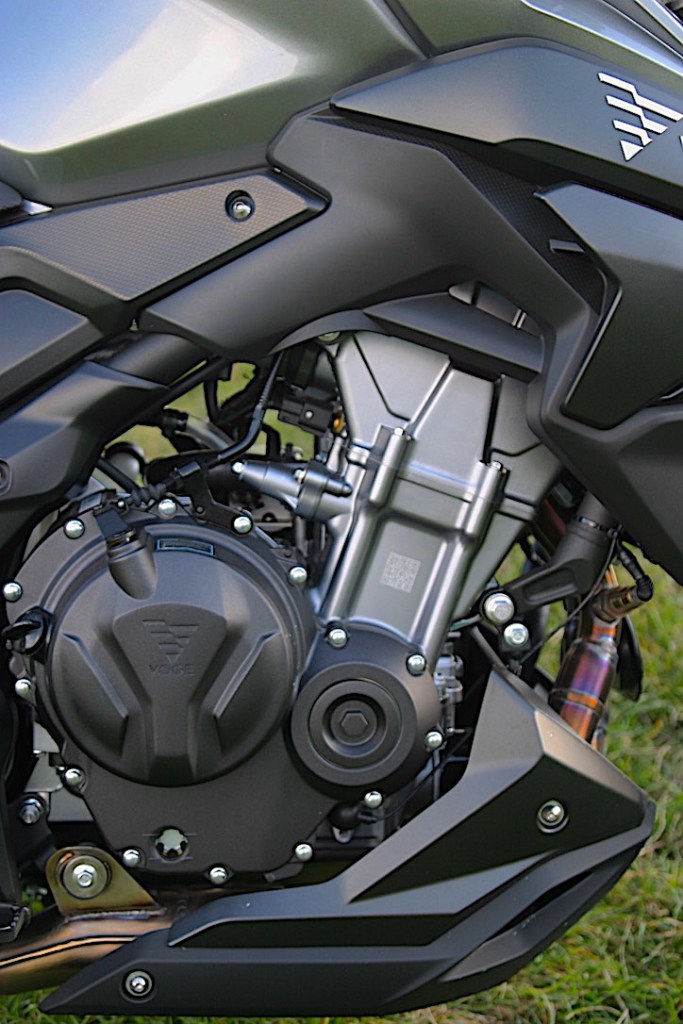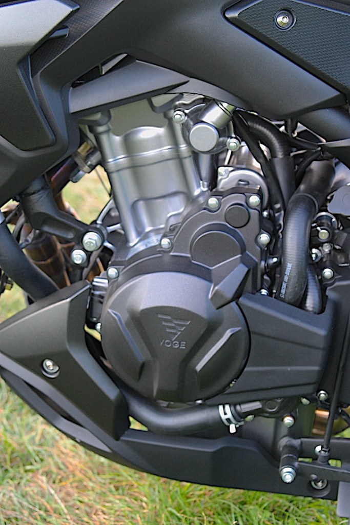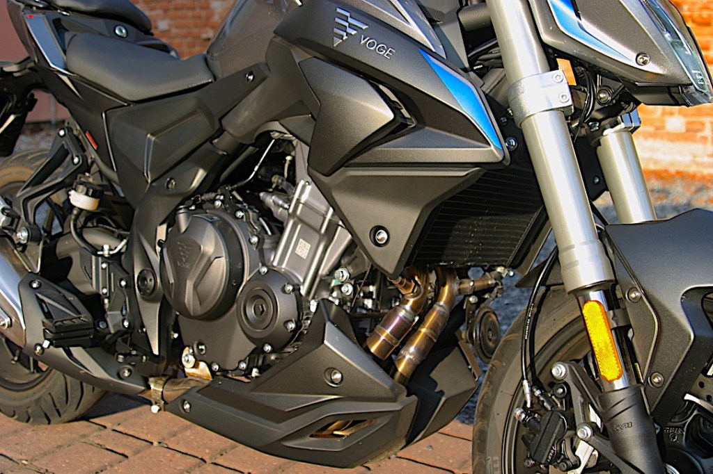 VOGE 500 R dokonale zapadá do současného trendu ostře řezaných, dynamických tvarů. Dynamická linka „jede“ od plně LED reflektoru až po madla spolujezdce a LED koncová světla. Motorka na první pohled vypadá menší, nežli jaká ve skutečnosti je. Trochu klame tělem. Se svými 185 centimetry jsem neměl vůbec žádný problém se na ni poskládat v docela uvolněné pozici. Kdybych byl býval sundal gumové špunty ze stupaček, bylo by to ještě lepší. Ale na tři–čtyři dny ježdění to nestálo za to. Při fotografování jsem ji samozřejmě obešel mnohokrát kolem dokola a prohlížel si jí zblízka i z dálky a – světe div se – nenašel jsem na ní snad nic, co by mi vadilo. Všechno na sebe příjemně a logicky navazuje a každý detail je řemeslně dokonale zpracován. Nenajdeme zde laciné materiály, které bychom u motorky v této cenové kategorii právem očekávali. V tomto směru ničím nezaostává za renomovanou konkurencí a rozhodně si s ní nikde neuděláme ostudu. Do ruky dokonale padnoucí kónická řídítka, skvěle čitelný displej a zpětná zrcátka, která se ani nezachvějí. To je, co máme stále na očích. Hezky tvarovaná nádrž, s bočními panely, na ní navazuje příjemně tuhé, a přitom pohodlné sedlo. Sedlo spolujezdce je samostatné a vybavené dvojící madel dokreslujících dynamický design stroje. Spodní, „technické“ části dominuje moderní dvouválcový motor s krásně vyvedeným výfukem, který zespodu chrání masivně působící plastový kryt.