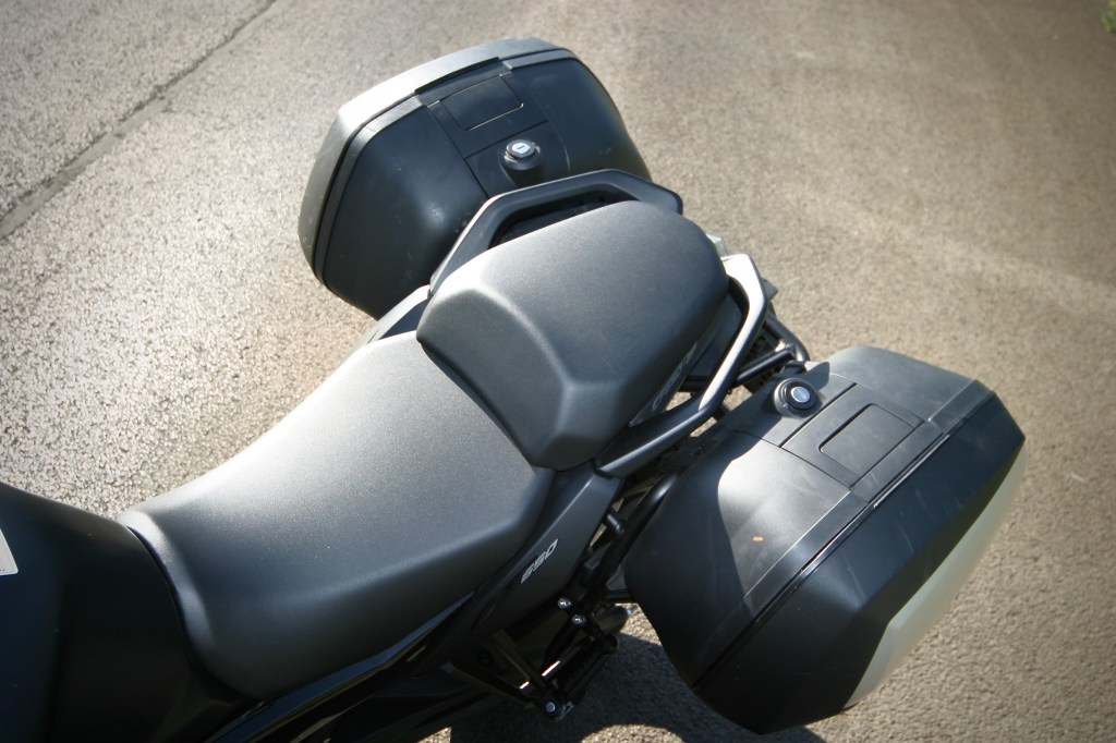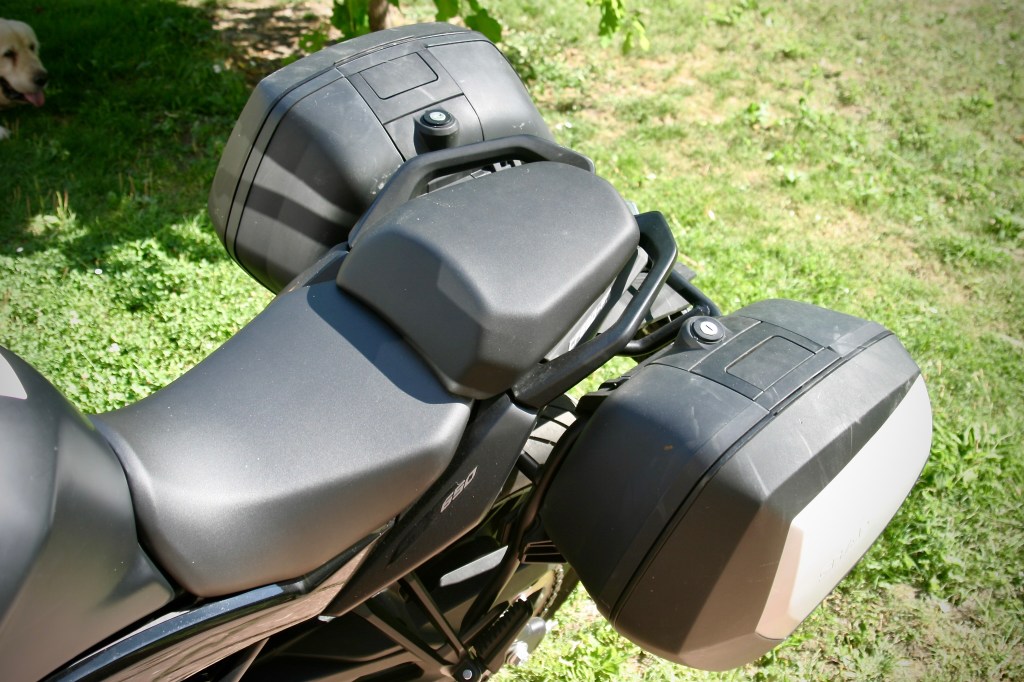 Nemohu posoudit, jak motorka funguje při jízdě ve dvou a s využitím poměrně velkého objemu bočních kufrů (2×36 l.). Nebo ještě s centrálním kufrem. Ale když jedeme takto naloženi, dá se předpokládat, že nikam nepospícháme a nepouštíme se ani do krkolomných předjížděcích a jiných manévrů. To přece jezdíme v klidu a pohodově.