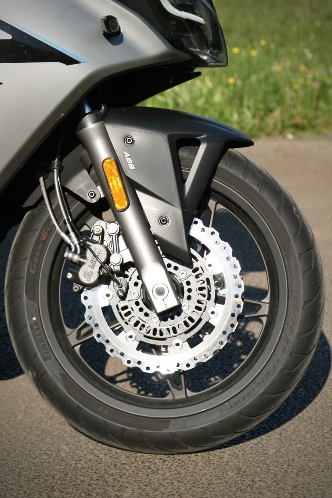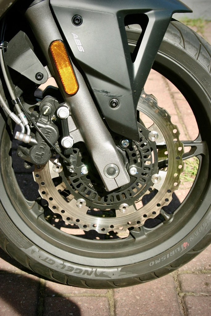 Španělské kotoučové brzdy J.Juan jsou naprosto spolehlivé a velmi příjemně dávkovatelné. Zcela odpovídající charakteru 650GT.