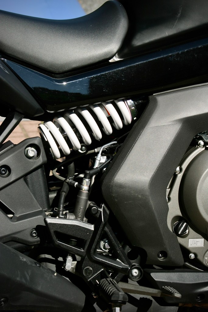 Podvozek od japonské KYB je jednoduchý, seřizovat se dá „pouze“ předpětí zadní pružiny, ale spolehlivě odvádí naprosto solidní práci. Bez ohledu, jestli jedeme po úplně novém, rovném asfaltu anebo takovém tom uplácaném lopatou. Na něm je to pravda trochu neklidnější, ale zcela spolehlivě vede požadovanou stopu. Samozřejmě tomu přispívají také velice kvalitní pneumatiky. Jízdní vlastnosti jsou tedy velmi bezpečné a hlavně, předvídatelné. Motorka vám neudělá něco, co by se nedalo zvládnout. Samozřejmě, pokud neděláme žádné koniny. Kontrolu trakce naštěstí nemá. Stejně nejlepší kontrola trakce je na ose: oči – mozek – zápěstí pravé ruky. Když nezabere oční „prevence“, poznáme to v hýždích, se kterými nám každé podjetí zadního kola lehce škubne.