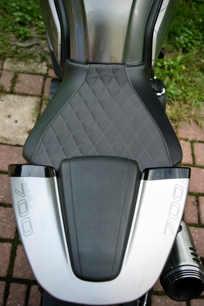 Hned v prvním okamžiku, jakmile jsem se na ni posadil a rozjel, mi bylo jasné, že mne bude hodně bavit. Musel jsem se docela krotit. První den na nové motorce začínám vždy přece jenom opatrněji. Musím si ji nejprve trochu osahat. Naučit se na ni sedět. Vyzkoušet, jak se pode mnou bude chovat. Možná raději – jak se budu chovat já na ni. Nevzpomínám si totiž, jestli jsem vůbec někdy jel na motorce s řídítky otočenými dolu, a ještě k tomu – monoposto. Takže to pro mne byl zcela nový, naprosto originální zážitek. Vždy jsem měl nějaký pocit, že mne na těchto motorkách budou víc bolet záda, krční svaly, že z nich budu blbě vidět – no prostě – předsudečná obava. Už během prvních posázavských kilometrů se ale ukázalo, že zhola zbytečná. Že jsem se připravoval o spoustu krásných jezdeckých zážitků. A motorkář je živ hlavně – zážitky. Proto to přece děláme.