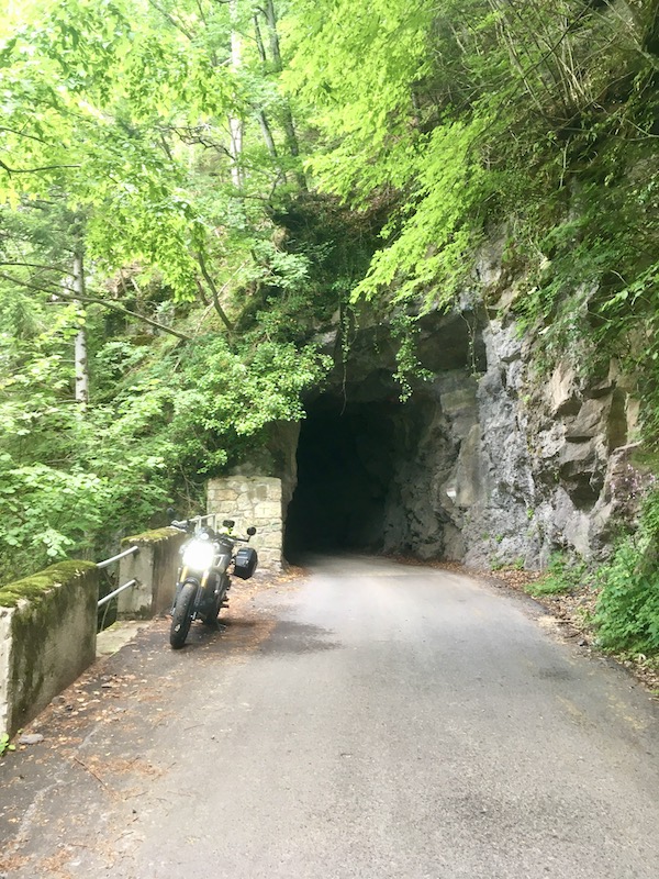 Na sjezdu zastavuji vyfotit jeden z tunelů, když se ke mně směrem do kopce blíží dva cyklisté asi tak v mém věku. Sundávám helmu a když jedou kolem mne, tak ji před nimi smekám. Kdo tam někdy byl, ví proč.