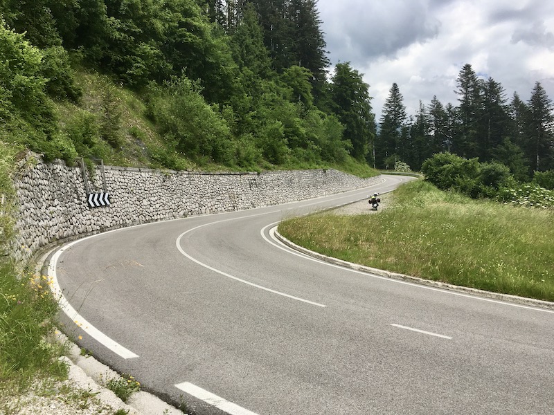 Sjezd do Comeglians je také nádherný. V horní části vyhlídkový, ve střední opravdu plný neskutečně ostrých, úzkých zatáček a v dolní provázený projevy těžby dřeva. Nabažen výhledy si už „jenom“ užívám jízdu a vůni ranního lesa. Sjíždím do údolí a tím je vlastně moje mise skončena. Už mne čeká návrat domů. V obci Rivo odbočuji směr „Austria“. Před sebou mám přejezd Passo di Monte Croce Carnico, neboli Plöckenpass. Z italské strany je to krásné svezení. Na posledních šesti kilometrech je šest pravotočivých a šest levotočivých serpentin, vybudovaných v hodně strmém, skalnatém svahu. Pravotočivé doslova kolem kolene, první tři levotočivé se dají jet v krásném náklonu, poslední tři jsou schované částečně do tunelů. Z toho poslední komplet. No a v tom posledním, když vjíždím do jeho nejtemnější části, si protijedoucí obytňák přisvítí dálkovými světli. Proč, vůbec nevím. Ale v ten moment nevidím vůbec nic. Když zase vidím, míří si to moje přední kolo do žlábku na odvod dešťové vody. Za žlábkem už je jenom zeď. Moji ochránci mají zase jednou co dělat. V průsmyku zastavuji a chvilku to rozdýchávám. Jak je italská strana krásná, tak ta rakouská připomíná náš středočeský tankodrom. Asi jim už taky docházejí peníze.