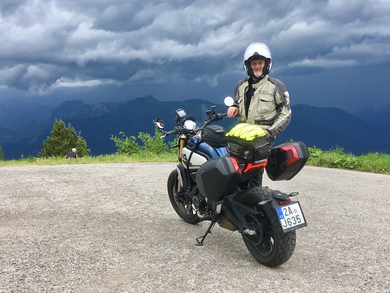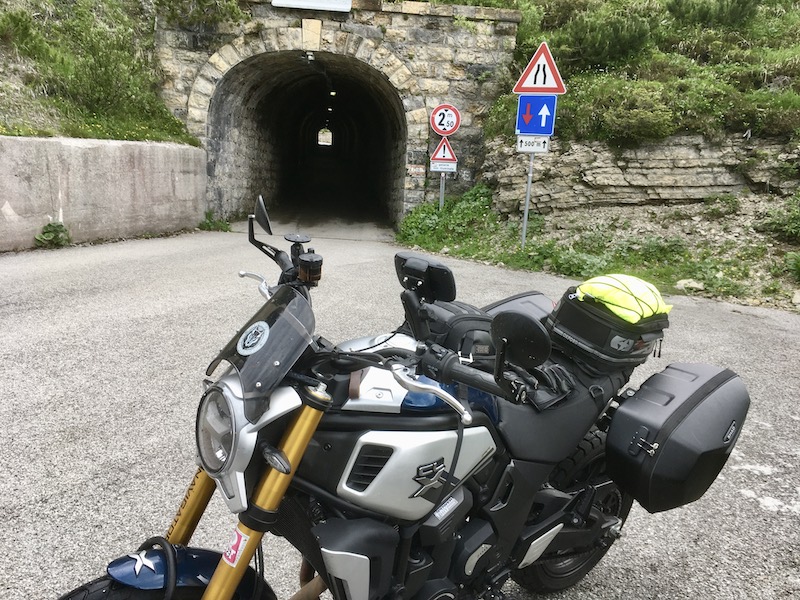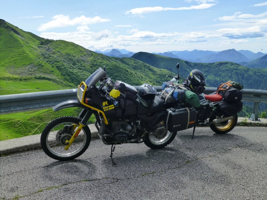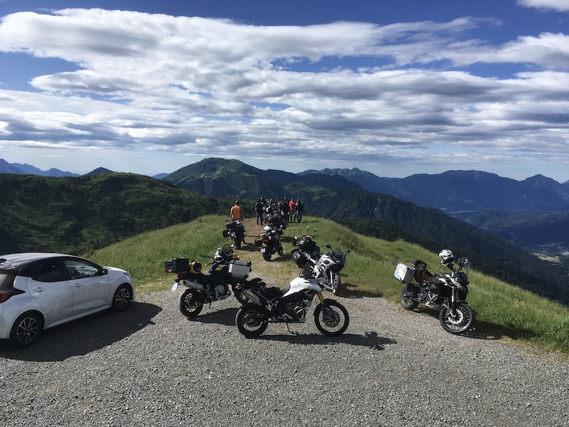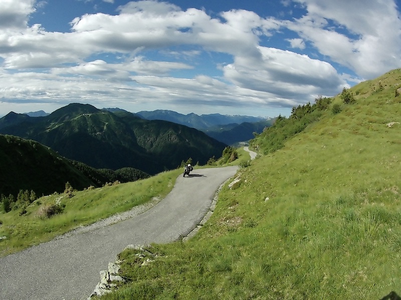 Jediná místa, kde bych přesedl na něco lehčího, na užších pneumatikách s výraznějším vzorkem a možností jet ve stupačkách, byly stoupavé úseky na PASSO DEL CASON DI LANZA a PANORAMICA DELLE VETTE. Ale bůh ví, jak by to dopadlo. Takto jsem jel tempem odpovídajícím svým schopnostem, zadní pneumatice šířky 180 mm a nemožnosti jet ve stupačkách. Na druhou stranu, neměl jsem problém kdekoliv zaparkovat, protože jsem naprosto bezpečně dosáhl na zem. Jeden z italských jezdců velkých endur, se kterými jsem se sešel (viz. fotografie) měl velký problém otočit zaparkovanou, tuším DUCATI MULTISTRADA, protože z ní na nerovnostech nedosáhl bezpečně na zem. O nemožnosti se nohama odstrčit ani nemluvě.