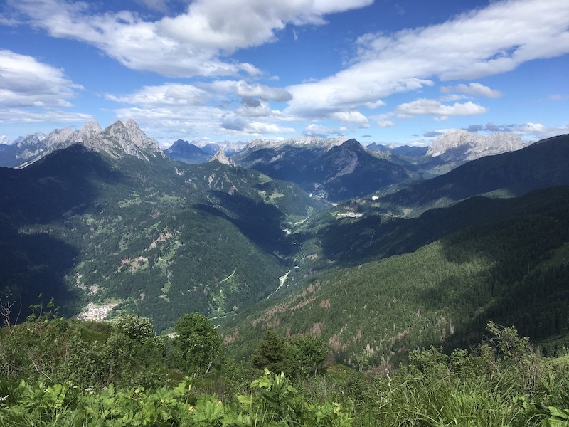 V Chiusaforte odbočuji na sever do Pontebby. Projíždím krásným centrem, které doslova láká k posezení v některé z kaváren a hledám odbočku na Passo del Cason di Lanza (1 562 m). Až doma jsem přišel na to, proč mi ho navigace odmítala najít. Měl jsem zakázané nezpevněné cesty. Nakonec jsem si všiml velmi nenápadné směrovky, která mne zachránila. Samozřejmě jsem věděl, do kterého údolí mám jet. Ale tato silnice budí dojem, že skončí nejdále v nějakém místním dvoře. Prostě si musím věřit a jet. Navigace mne totiž pořád a pořád vnucuje obrat do protisměru a cestu okolo horského masivu a příjezd do sedla z opačné strany. Po opravdu velmi úzké silnici, kde nechci potkat nikoho v protisměru, začínám stoupat severozápadním směrem. Takže správně. Nejprve jedu hlubokým údolím, podél nádherné horské říčky, jejíž průzračná voda padá v mnoha kaskádách. Silnice se kroutí čím dál víc, místy je propadlá, místy opravdu velmi úzká a většinou zcela nepřehledná. Je vidět doslova na pár metrů před sebe. Ideální pro jízdu ve stupačkách. Nechce se mi věřit, že jedu tou samou cestou, kterou v roce 2013 vedla jedna z etap Giro d`Italia. Tohle není na závodní, ale horské kolo. Když už. Cesta, nebudu psát „silnice“, stále stoupá a stoupá, otevírají se nádherné výhledy, až přijíždím na její vrchol. Pasou se tady krávy, je tu jedna horská farma poskytující občerstvení a pouzí dva cyklisté. A hlavně tabulka, potvrzující, že tudy Giro d`Italia v roce 2013 opravdu jelo. Chvilku nasávám horskou atmosféru, dělám pár fotek a pokračuji dál. Tentokrát pro změnu stále z kopce, až do Paulara. Opět úžasný jezdecký zážitek. Do naprosté většiny zatáček je nutné jet velmi obezřetně. Cestou potkávám asi dvě nebo tři motorky, jednoho cyklistu a jedno auto. Naštěstí až úplně dole, kde je silnice občas malinko rozšířená, právě pro vyhýbání se.
